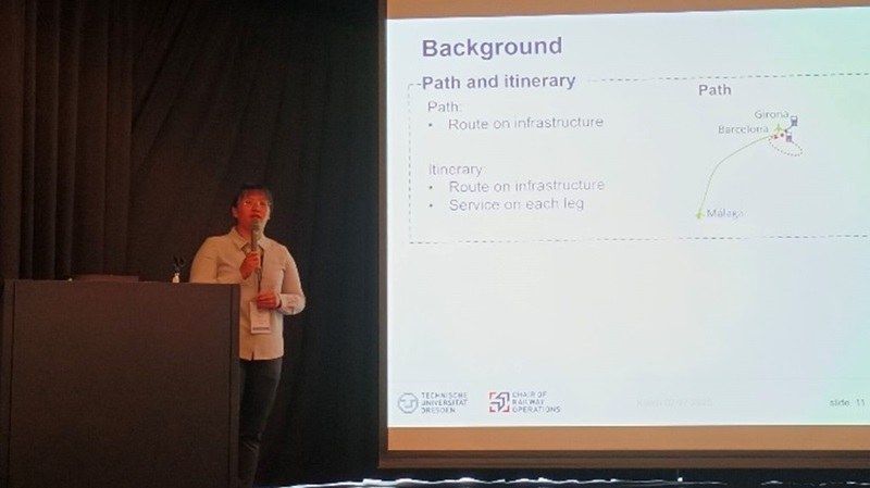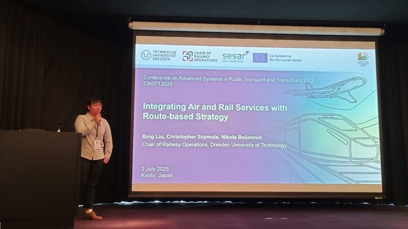 At the 2025 event, postdoctoral researcher Bing Liu from the Dresden University of Technology (TU Dresden) presented the MultiModX project, which is funded by the Single European Sky ATM Research 3 Joint Undertaking (SESAR 3 JU) and the European Union. In particular, he detailed the study “Integrating Air and Rail Services with Route based Strategy”, co authored with Dr Christopher Szymula and Dr Nikola Bešinović. This research introduces a route based planning framework designed to coordinate rail and air services more effectively, thereby enhancing system efficiency and multimodal connectivity.