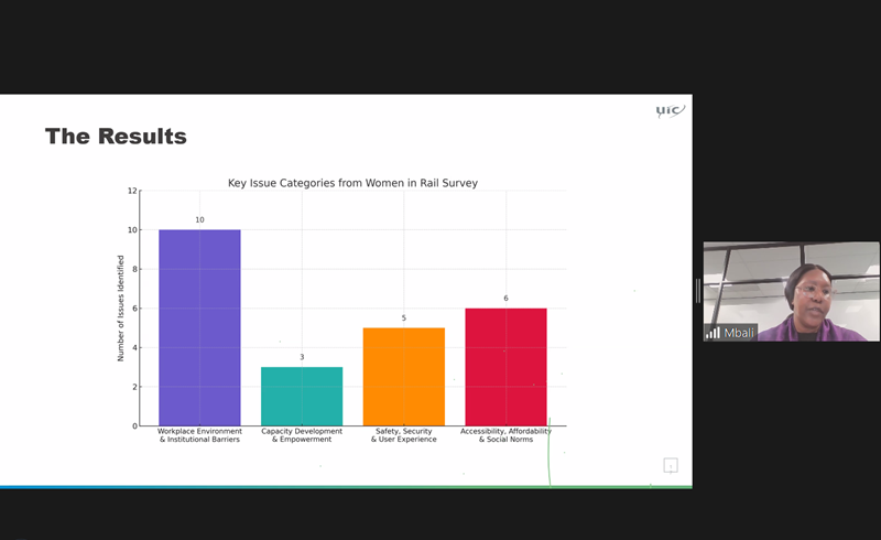 Ekeke then presented the results of a pre-meeting survey highlighting key gender-related challenges in the rail sector, including: