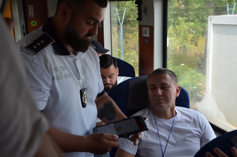 Romanian Border Officer performing passenger checks onboard the train using ODYSSEUS technology