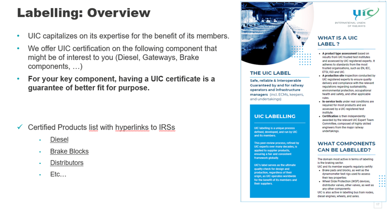 - The development of technical and operational standards to foster interoperability and international cooperation, including technical leaflets, specifications, labels and guidelines widely adopted by UIC members