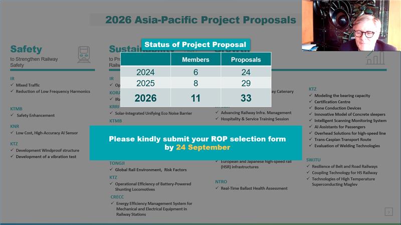 Following a successful series of regional webinars, UIC Asia-Pacific region held its fourth session of the 2025 Web Meeting Series on 18 September 2025, focusing on essential UIC publications and tools available to members. The session was designed to foster greater engagement in UIC initiatives and help members to maximise their membership benefits.